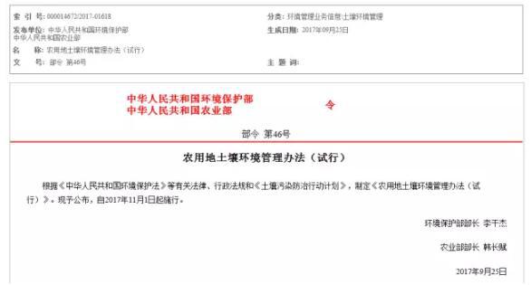 將于11月1日起施行的《農(nóng)用地土壤環(huán)境管理辦法(試行)》規(guī)定,禁止在農(nóng)用地排放、傾倒、使用污泥、清淤底泥、尾礦(渣)等可能造成對土壤污染的固體廢物。