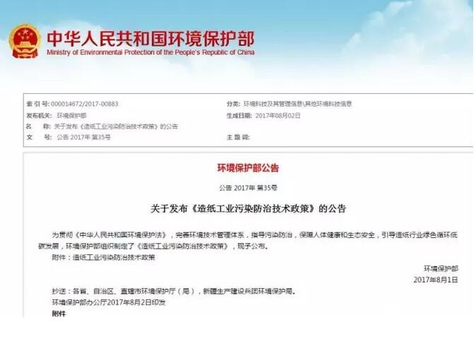 環保部發布:關于造紙工業污染防治技術政策