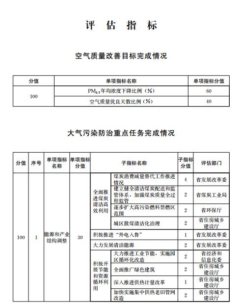 大氣污染防治重點任務完成情況包括能源和產業結構調整、工業污染綜合治理、揚塵污染綜合整治、機動車船排氣污染控制、綠色生態屏障建設、大氣污染防治資金投入、大氣環境管理等7項指標。大氣污染防治重點任務完成情況各指標的定義、評估要求和計分方法等由有關評估部門按照《二期行動計劃》的職責分工確定,評估部門根據子指標分值對各市重點任務進行打分,并向省環保廳提供評分結果。評估部門為兩個部門以上的,各評估部門分別打分后取平均值作為本項重點任務得分。