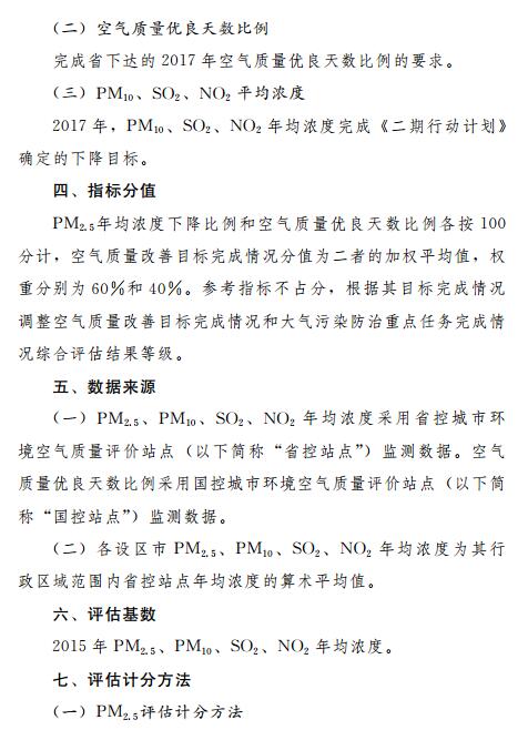 空氣質量改善目標完成情況以各市細顆粒物(PM2.5)年均濃度下降比例和空氣質量優良天數比例作為評估指標;將可吸入顆粒物(PM10)、二氧化硫(SO2)、二氧化氮(NO2)年均濃度下降比例作為參考指標。