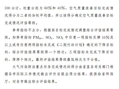 第四條評估采用評分法,空氣質量改善目標完成情況和大氣污染防治重點任務完成情況滿分均按滿分100分計,綜合評估結果為二者的加權平均值,權重分別為60%和40%。評估結果分為優秀、良好、合格、不合格四個等級,其中,評分結果90分及以上為優秀、70分(含)至90分為良好、60分(含)至70分為合格、60分以下為不合格。根據參考指標目標完成情況調整綜合評估結果等級作為最終評估結果。參考指標PM10、SO2、NO2中任意一項指標反彈10%及以上或有任意兩項指標未完成《二期行動計劃》確定的下降目標的,綜合評估結果等級降一個檔次;三項指標未完成下降目標的,降兩個檔次。最終評估結果等級最低檔次為不合格。
