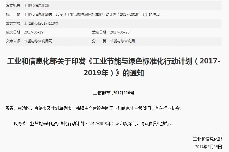 關于工信部印發《工業節能與綠色標準化行動計劃(2017-2019年)》的通知