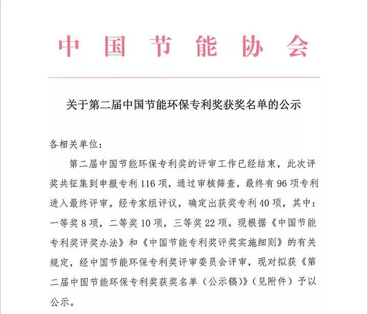 近期,中國節能協會公布了第二屆中國節能環保專利獎獲獎名單。