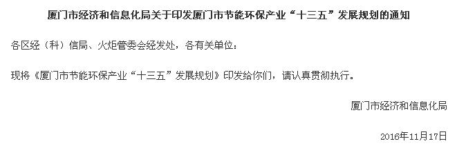 廈門市經濟和信息化局關于印發(fā)廈門市節(jié)能環(huán)保產業(yè)“十三五”發(fā)展規(guī)劃的通知: