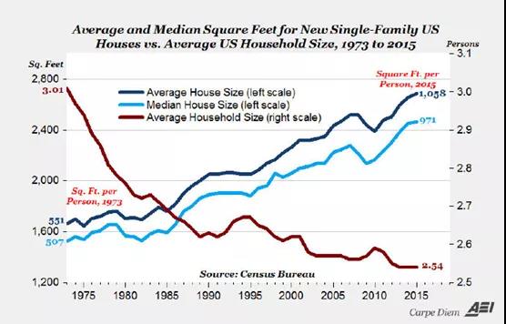 當然了,國內家庭各種家用電器也不少,怎么會跟美利堅老百姓有這么大的差距呢?首先我們的城市化水平還不如美國,還有幾億人住在農村。其次美國的人均住房面積大,比歐洲和中國都大不少,會帶來對空調,燈具和其他家電的使用也更為奢侈,下圖是美國的2015年新建的獨棟房屋的人均住房面積達到了1038平方英尺,超過96平米了,注意這可是人均啊,怪不得國內中產和土豪都喜歡去北美買大house。